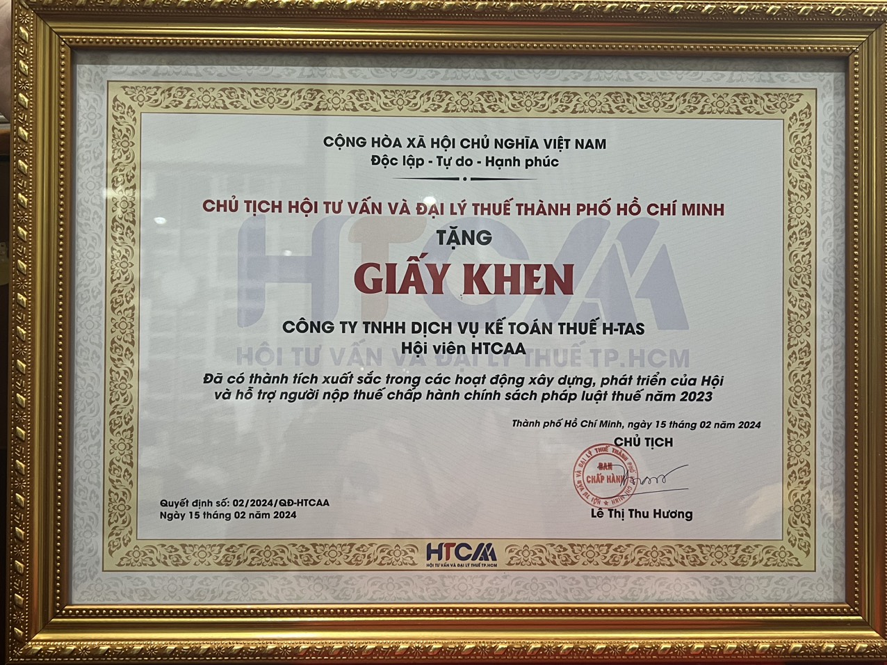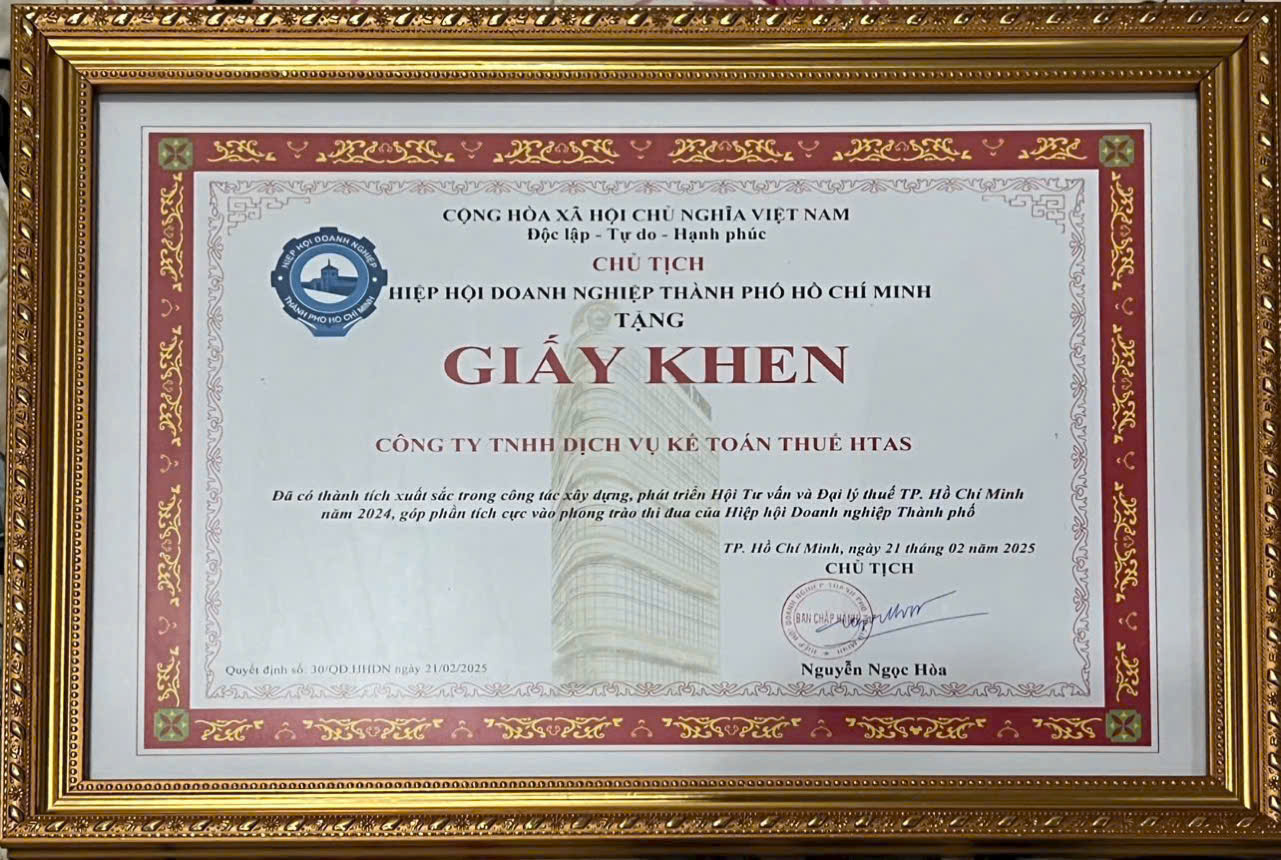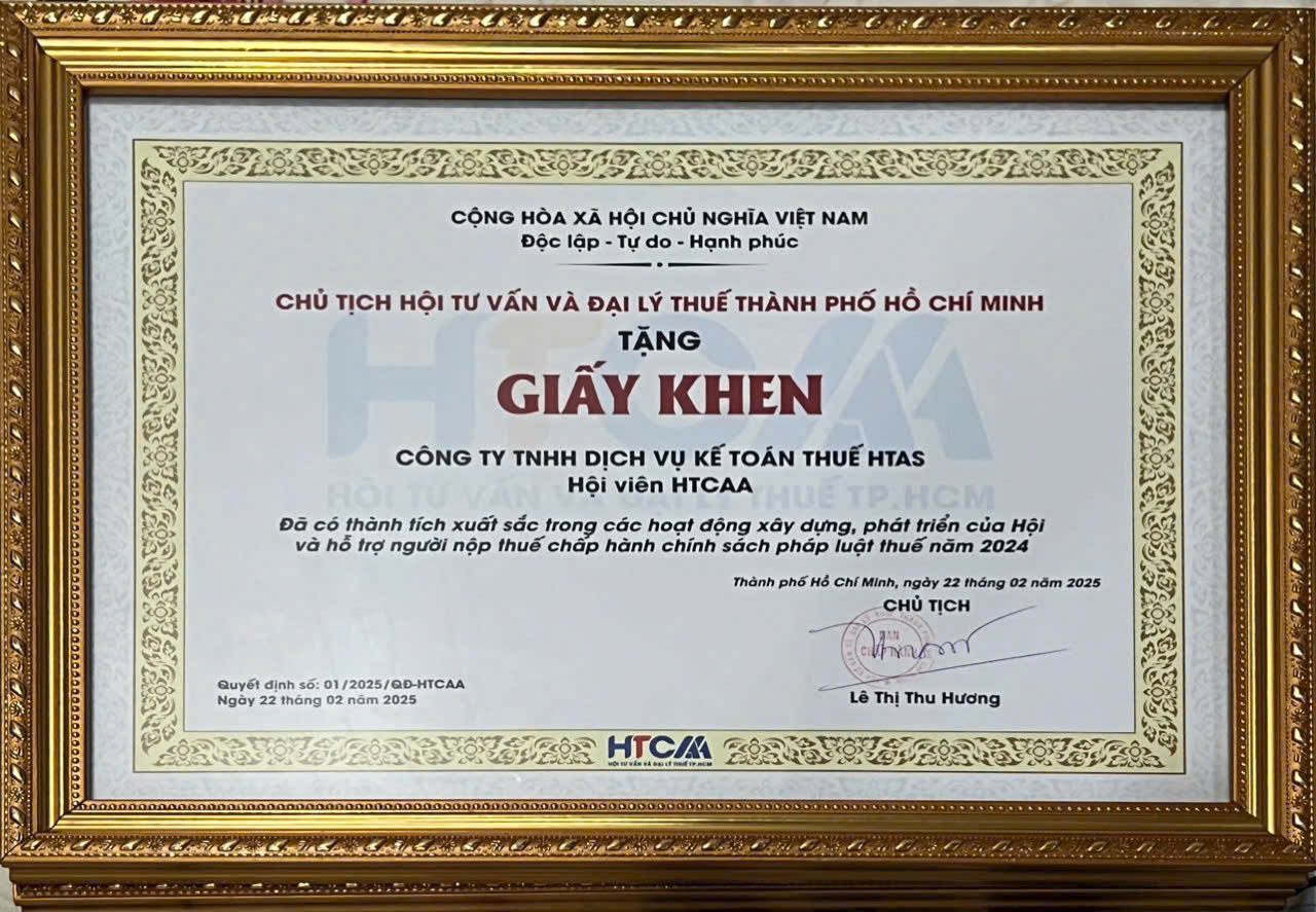 Đã có thành tích xuất sắc trong công tác xây dựng, phát triển Hội Tư vấn và Đại lý thuế TP. Hồ Chí Minh năm 2024, góp phần tích cực vào phong trào thi đua của Hiệp hội Doanh nghiệp Thành Phố.