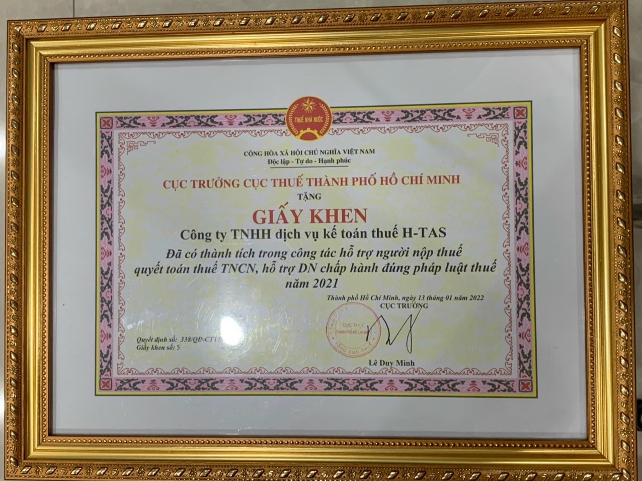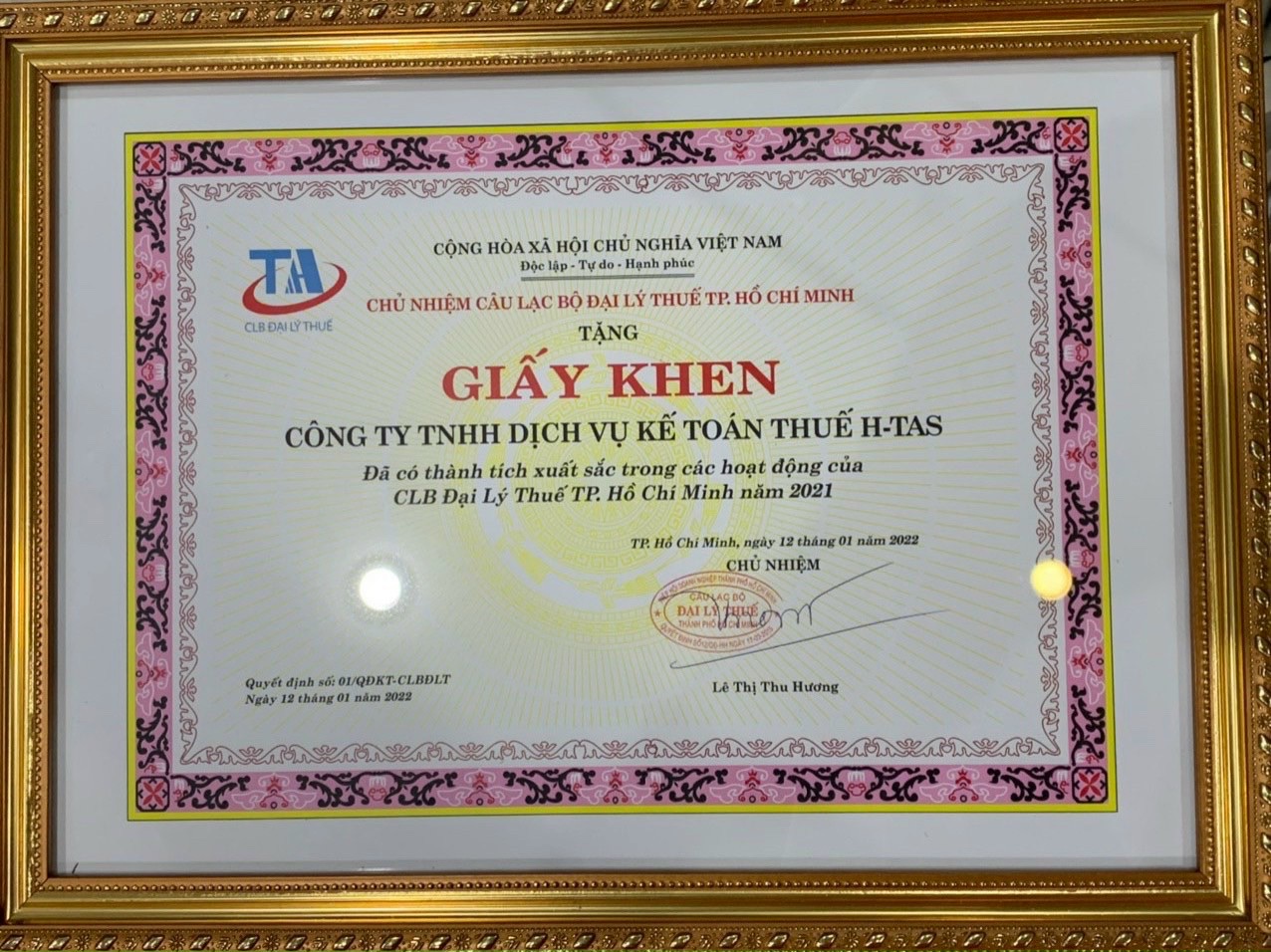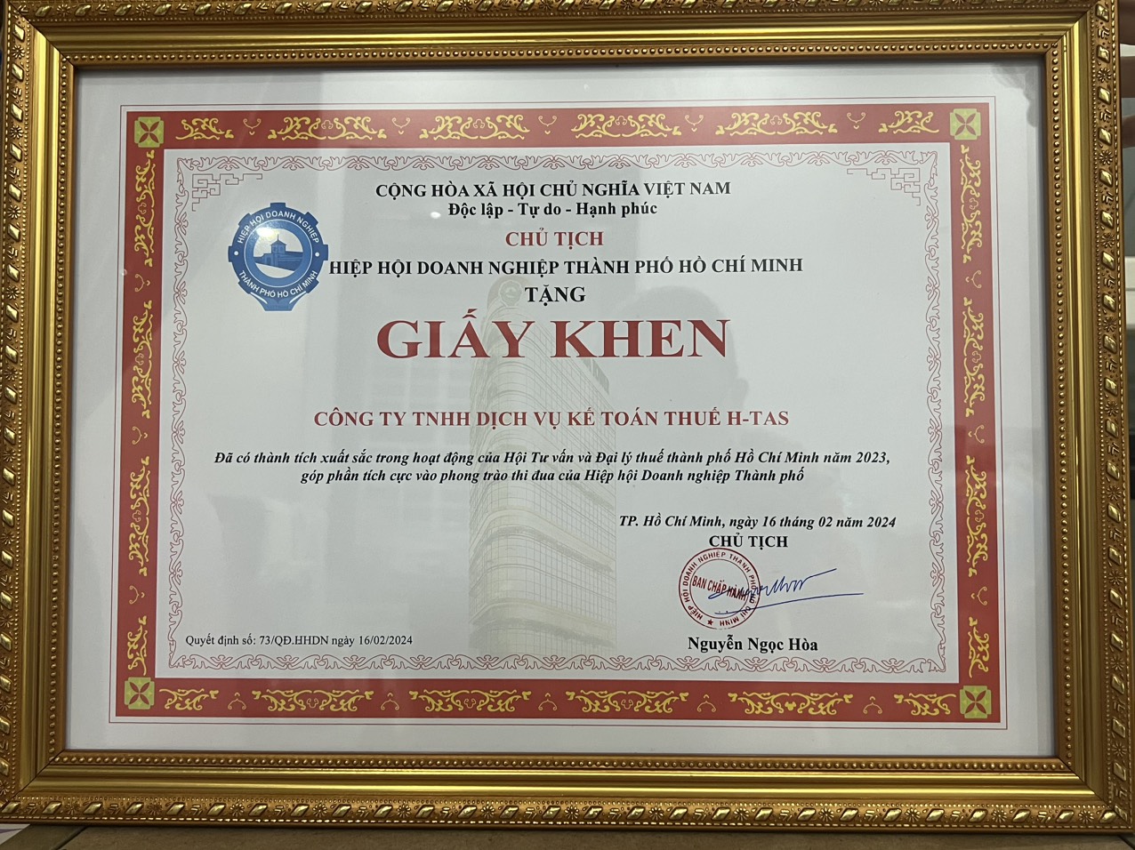Đã có thành tích xuất sắc trong công tác xây dựng, phát triển Hội Tư vấn và Đại lý thuế TP. Hồ Chí Minh năm 2024, góp phần tích cực vào phong trào thi đua của Hiệp hội Doanh nghiệp Thành Phố.