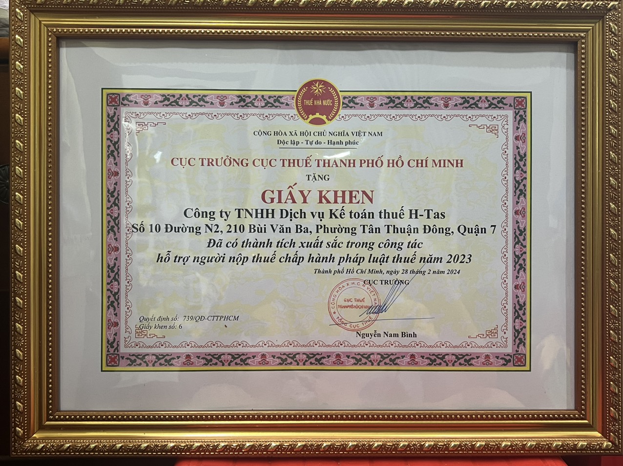 Đã có thành tích xuất sắc trong công tác hỗ trợ người nộp thuế chấp hành pháp luật thuế 2024.